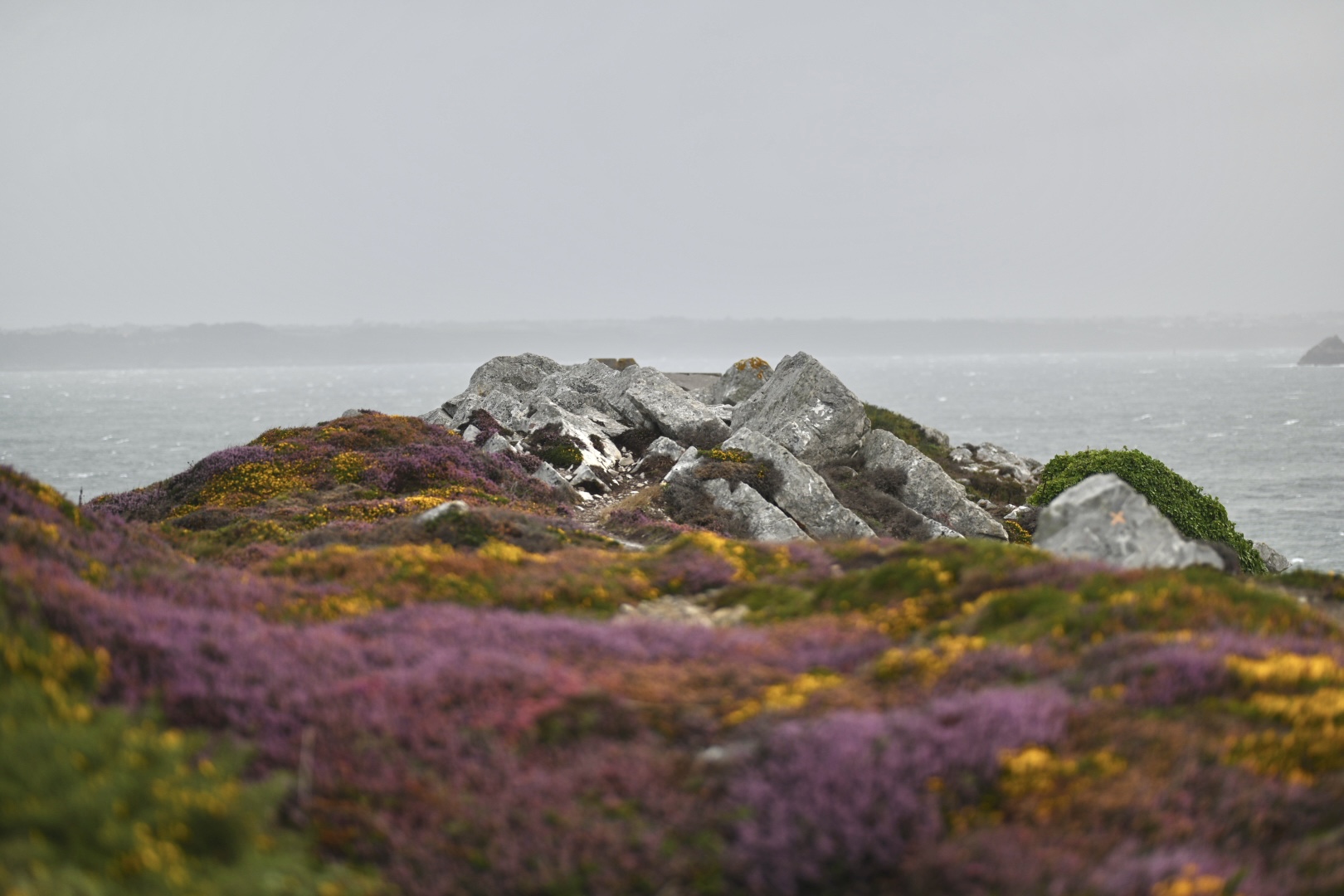 Camaret est décidément un petit village agréable. Si le temps avait été moche hier, j’avais signalé que le vent était absent. Et bien, c’était pour mieux souffler, puisqu’aujourd’hui le département est en vigilance météo orange. Tempête, coefficient de marée à 104, tout pour faire d’énormes vagues. Les personnes aperçues marchent en oblique tellement le vent est fort, c’est très impressionnant. Mais comme c’est bon. Je suis heureux comme un gamin qui retrouve ses tempêtes. La portion de rando est en plus vraiment belle. Bruyères partout autour de nous, rose, jaune et vert, front de mer de rochers déchiquettés, mer agitée, îlots, pointes, c’est sublime.